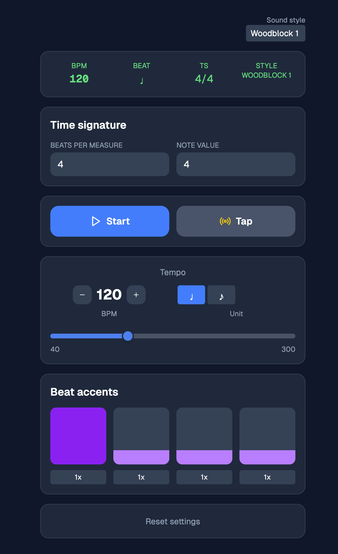 I developed this browser-based metronome application to solve a personal problem: the lack of a precise and feature-rich timing tool for practicing along with online videos and music on Youtube.