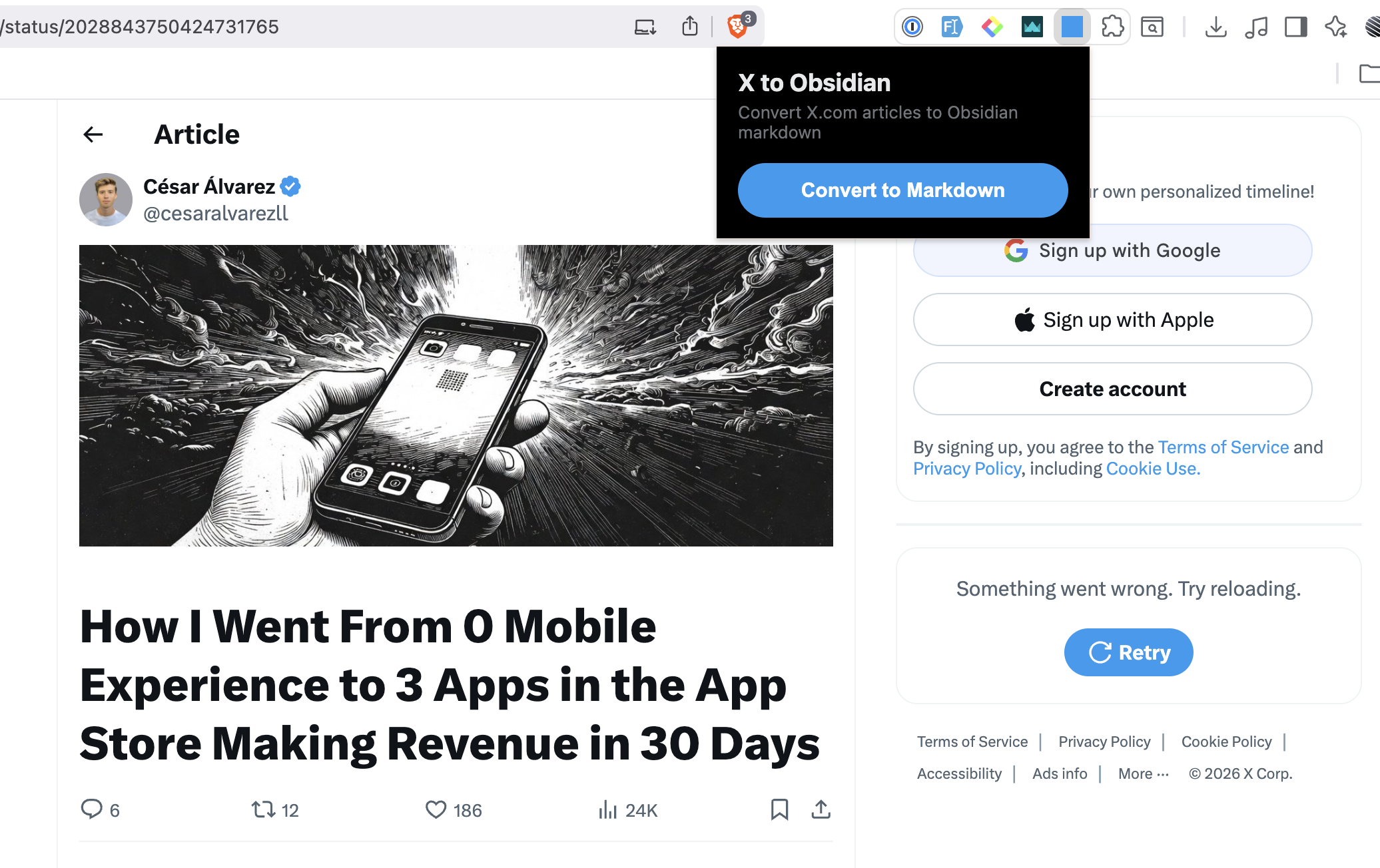 So I built a tiny Chrome/Brave extension that does one blunt, practical thing: it converts an X.com article into an Obsidian-friendly Markdown file. One click, a clean .md, ready to drop into a vault.